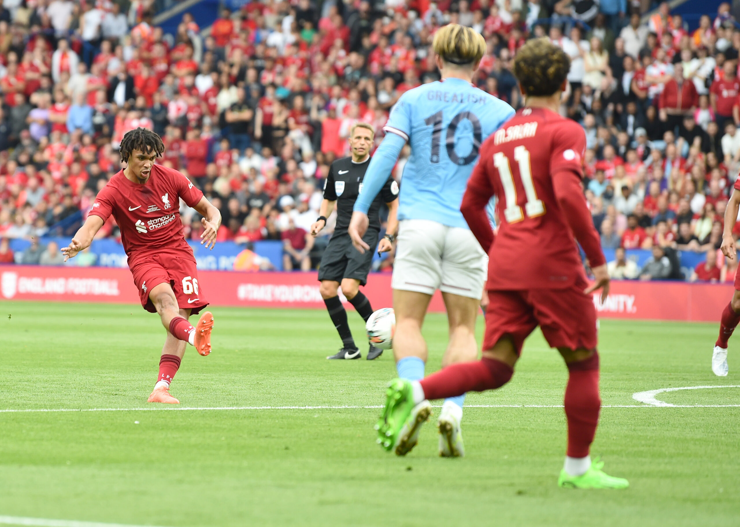 وجاء هدف ليفربول بعد مرر تياجو الكرة إلى صلاح الذي بدوره يقوم بتمريرة من لمسة واحدة إلى ترينت ألكسندر أرنولد الذي يسدد كرة قوية تسكن شباك إيدرسون وتعلن تقدم الريدز بالأول في الدقيقة 21 من عمر اللقاء.