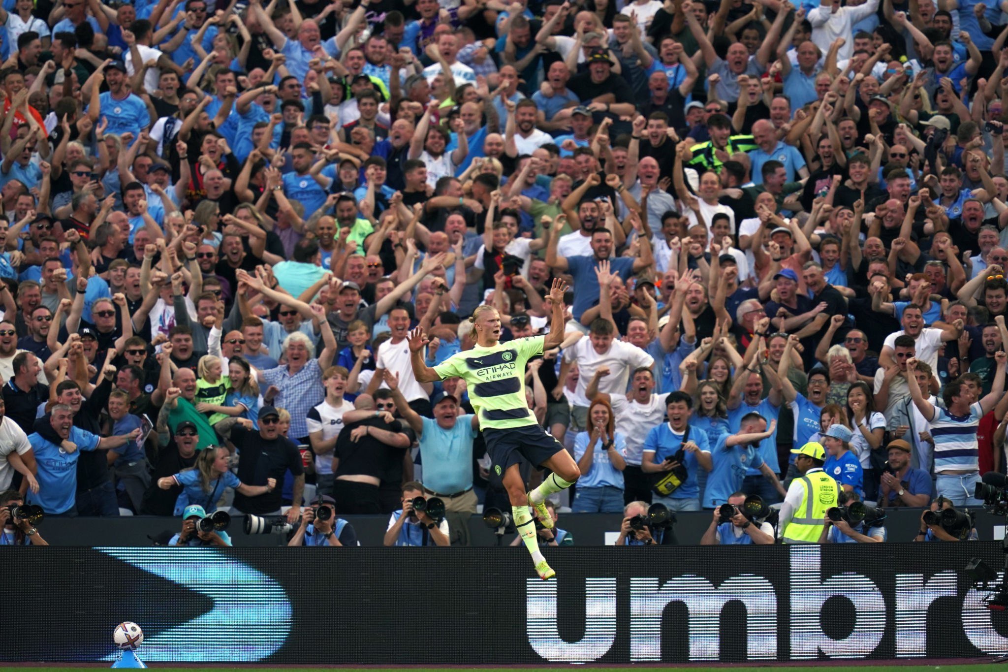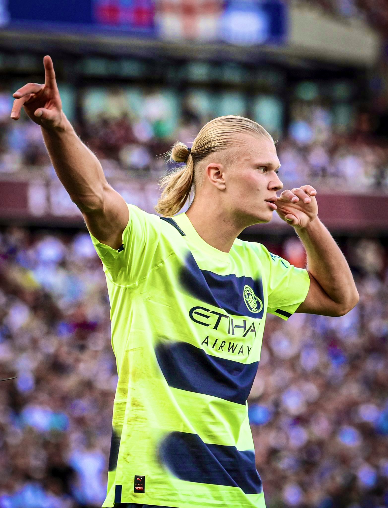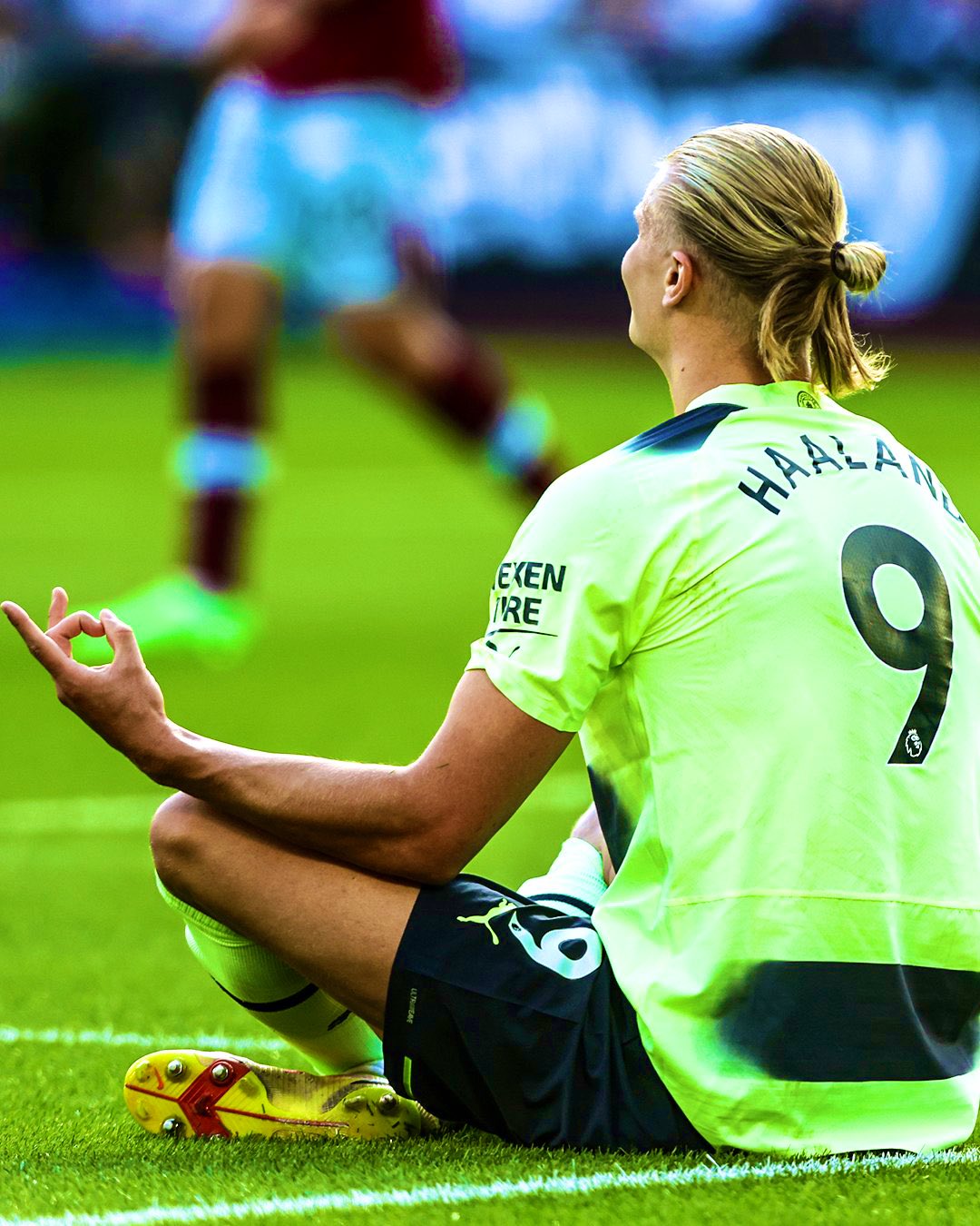 وخلال مباراة وست هام يونايتد في أفتتاحية الدوري الانجليزي، احتفل هالاند بإشارة المسدس في الهدف الثاني، ولكنه لم يفهم المراسلة عندما سألته عن احتفال المسدسات بالإنجليزية ولكنه لم يعرف معني الكلمة.