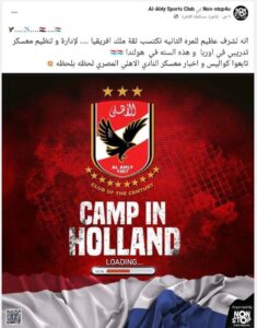 وكتبت شركة نون ستوب عبر حسابها على موقع التواصل الاجتماعي “فيسبوك”: “إنه لشرف عظيم للمره الثانيه نكتسب ثقة ملك افريقيا لإدارة و تنظيم معسكر تدريبي في أوروبا هذه السنه في هولندا، تابعوا كواليس و اخبار معسكر النادي الاهلي المصري لحظه بلحظه”.