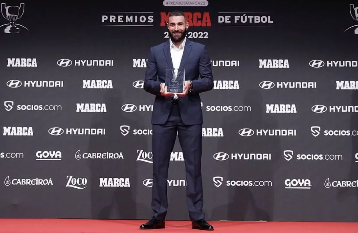 فاز الدولي الفرنسي كريم بنزيما مهاجم الفريق الأول لكرة القدم بنادي ريال مدريد، مساء اليوم الأربعاء، بجائزة دي ستيفانو كأفضل لاعب في الدوري الاسباني الممتاز لموسم 2021/22.
