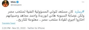 وكتب ميدو عبر حسابه على موقع التواصل الاجتماعي “تويتر”: “رينارد كان مستعد لتولي المسؤولية الفنية لمنتخب مصر ولكن عصابة السبوبة هاني ابوريدة واحمد مجاهد وصبيانهم اختاروا أجيري لقيادة منتخب مصر.. معلومة للتاريخ”.