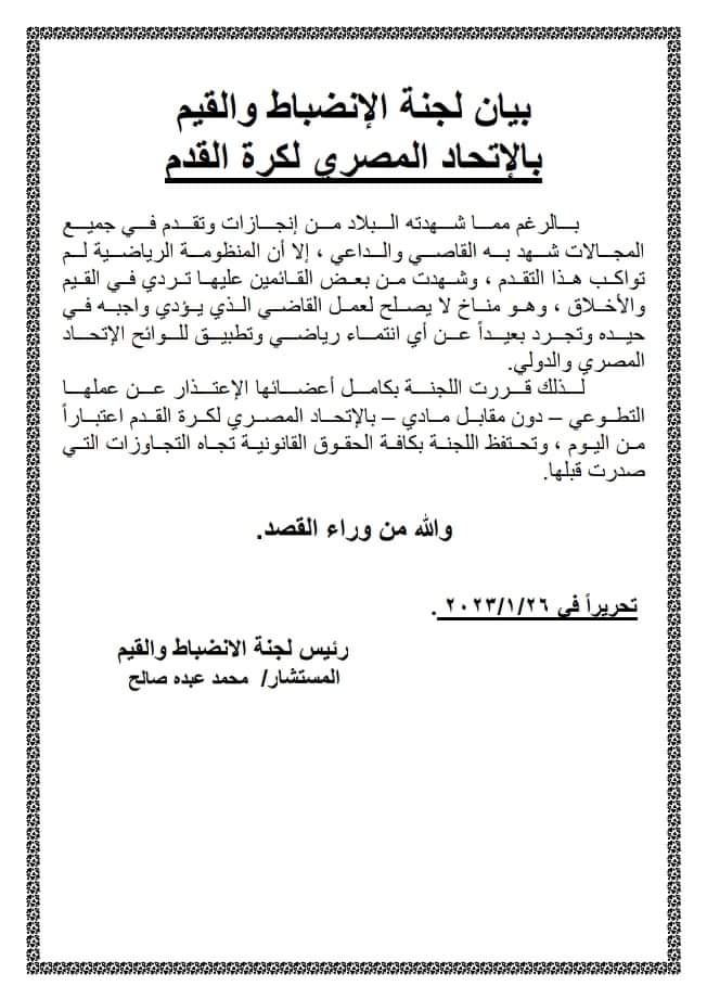 “وشهدت المنظومة من بعض القائمين عليها تردي في القيم والأخلاق، وهو مناخ لا يصلح لعمل القاضي الذي يؤدي واجبه في حيده وتجرد بعيدا عن أي انتماء رياضي وتطبيق للوائح الاتحادين المصري والدولي”.