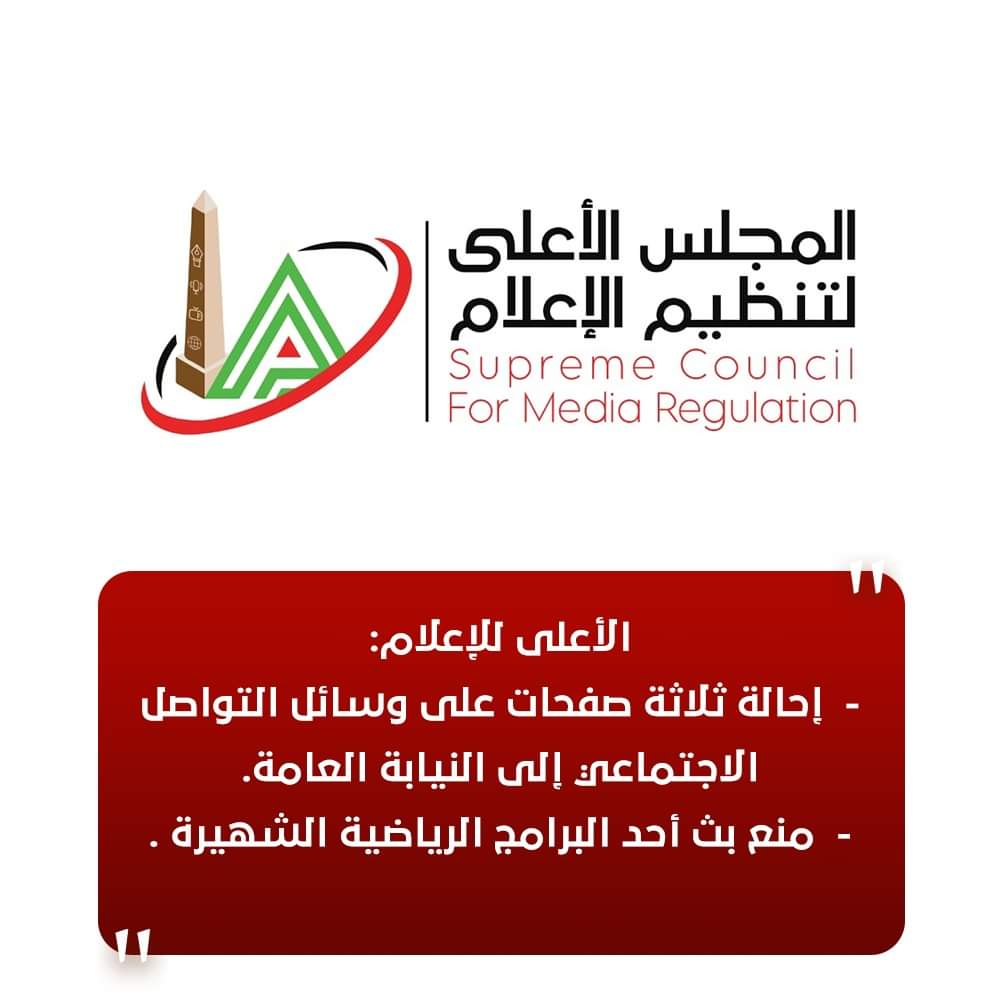 أصدر المجلس الأعلى لتنظيم الإعلام قراراً بإحالة الصفحات الخاصة بأحد الإعلاميين الرياضيين إلى النيابة العامة لإعمال شئونها طبقاً لأحكام قانون العقوبات والقوانين ذات الصلة.