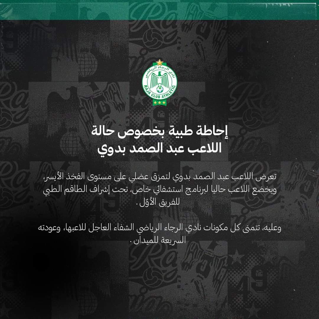 وأعلن نادي الرجاء المغربي إصابة لاعبه عبدالصمد بدوي بتمزق في عضلات الفخذ اليسرى، موضحا أن اللاعب يخضع حاليا لبرنامج استشفائي خاص تحت إشراف الطاقم الطبي للفريق الأول.