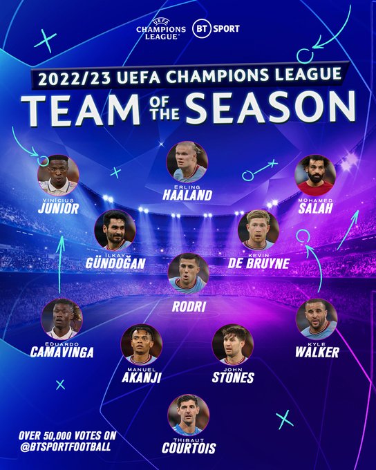 كشفت شبكة (BT SPORT) العالمية عن التشكيل المثالي للموسم الحالي لبطولة دوري أبطال أوروبا قبل ساعات قليلة من مباراة النهائي بين مانشستر سيتي وإنتر ميلان الأيطالي.